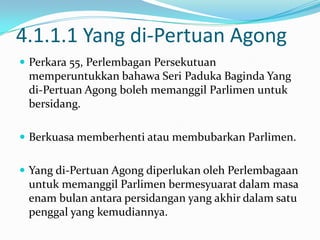 Yang di-Pertua dan Timbalan Yang di-Pertua Dewan Negara 57. Memanggil memprorog dan membubarkan Parlimen. Diperkenalkan pertama kali sebagai Perlembagaan Persekutuan Tanah Melayu pada Hari Kemerdekaan.